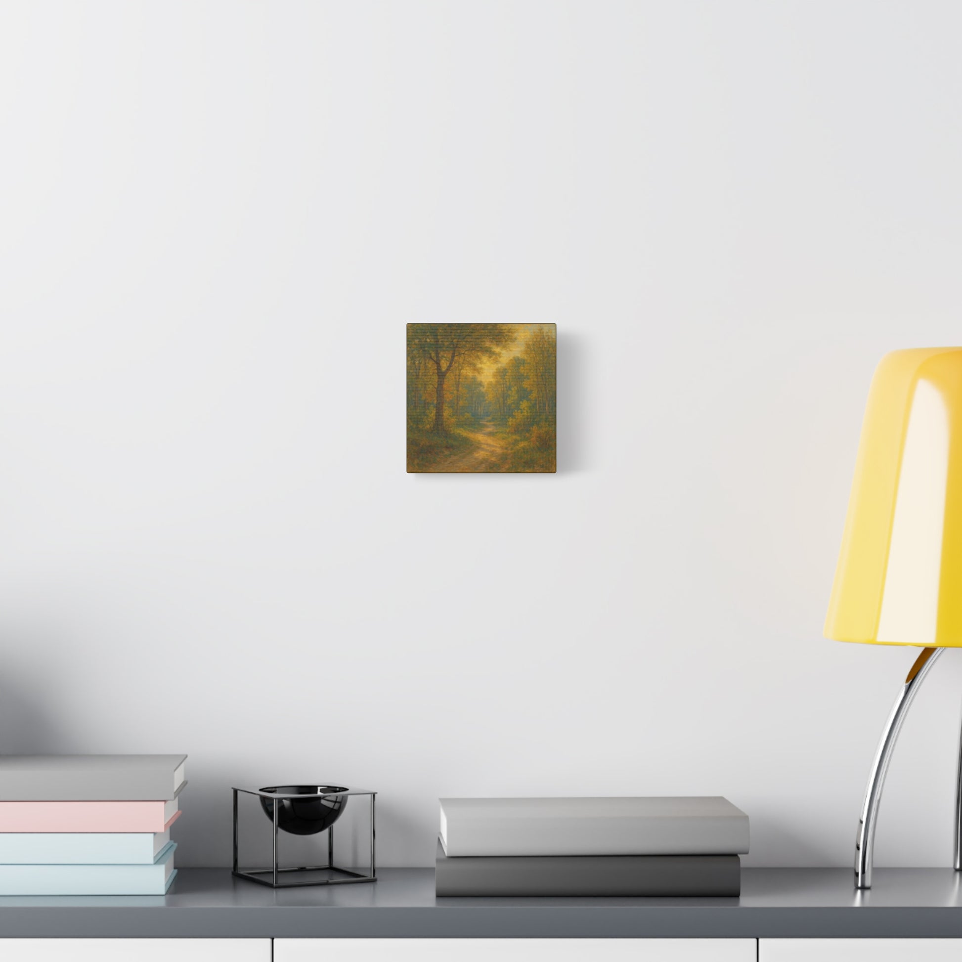 This stretched matte canvas brings a quiet, sun-warmed forest into any room. Soft golden light filters through tall trees, and a gentle path invites slow, reflective steps — the kind of scene that slows the breath and settles a busy mind. The low-sheen finish keeps glare to a minimum so the painting’s warm brushstrokes and subtle color shifts read naturally from near or far. Mount it above a reading chair, in a hallway that needs calm, or as part of a layered gallery wall to add an earthy, contemplative anchor.