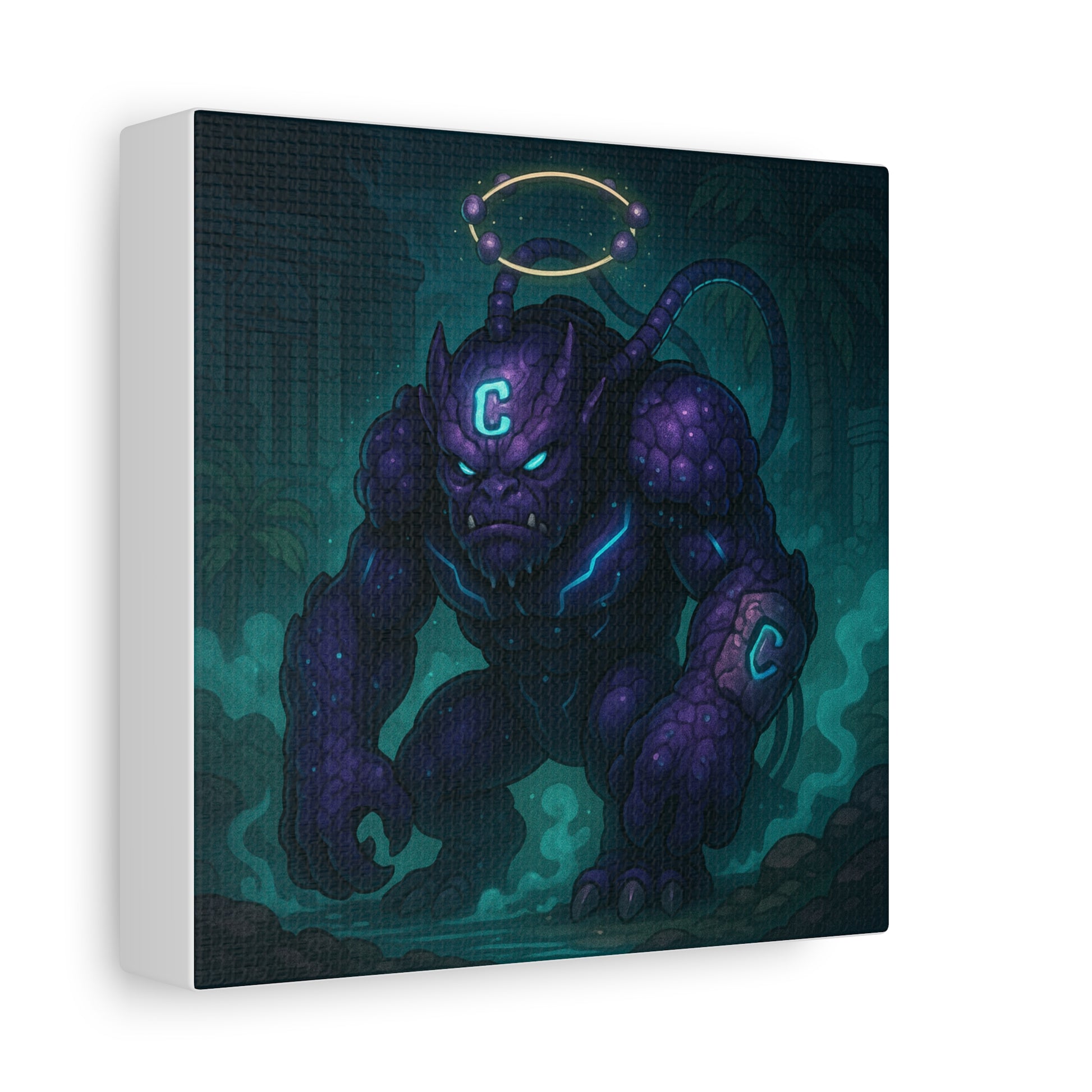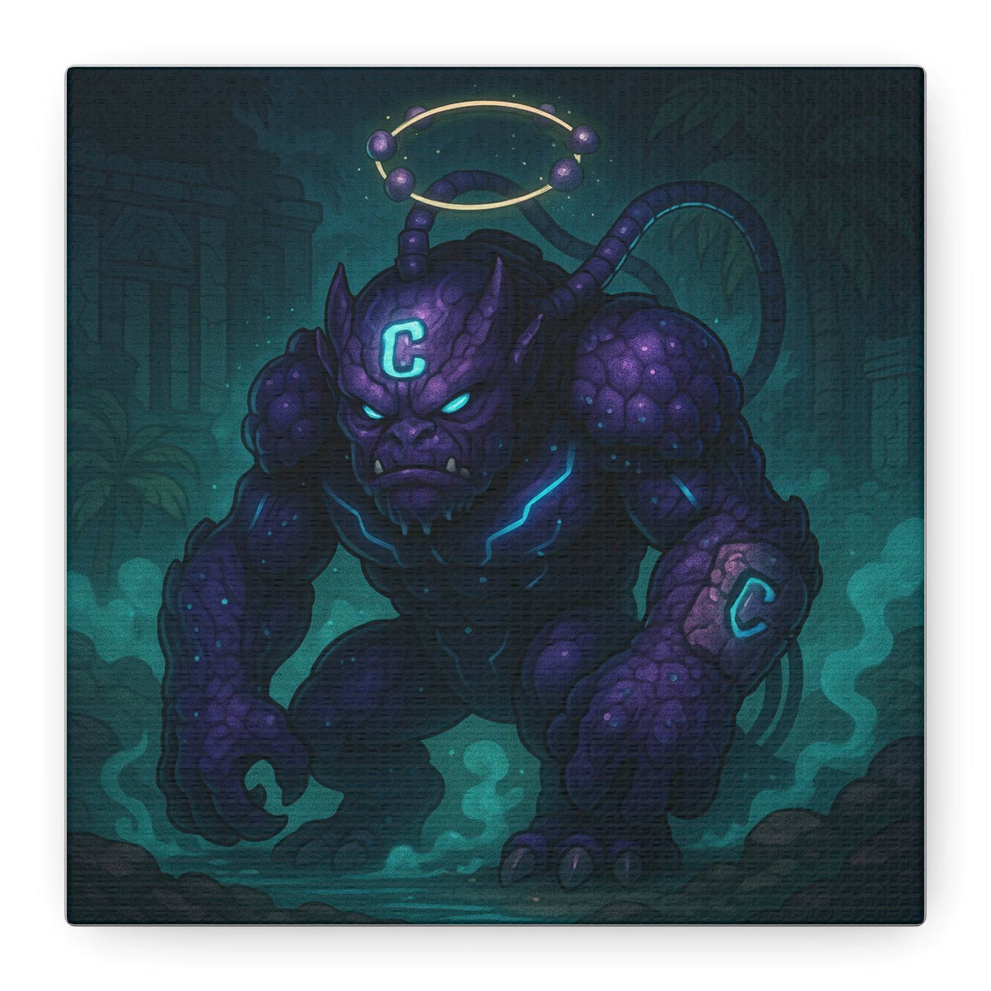 A hulking cyber-troll draped in regal purple armor, crowned with circuitry and cloaked in heavy sedative vapor.